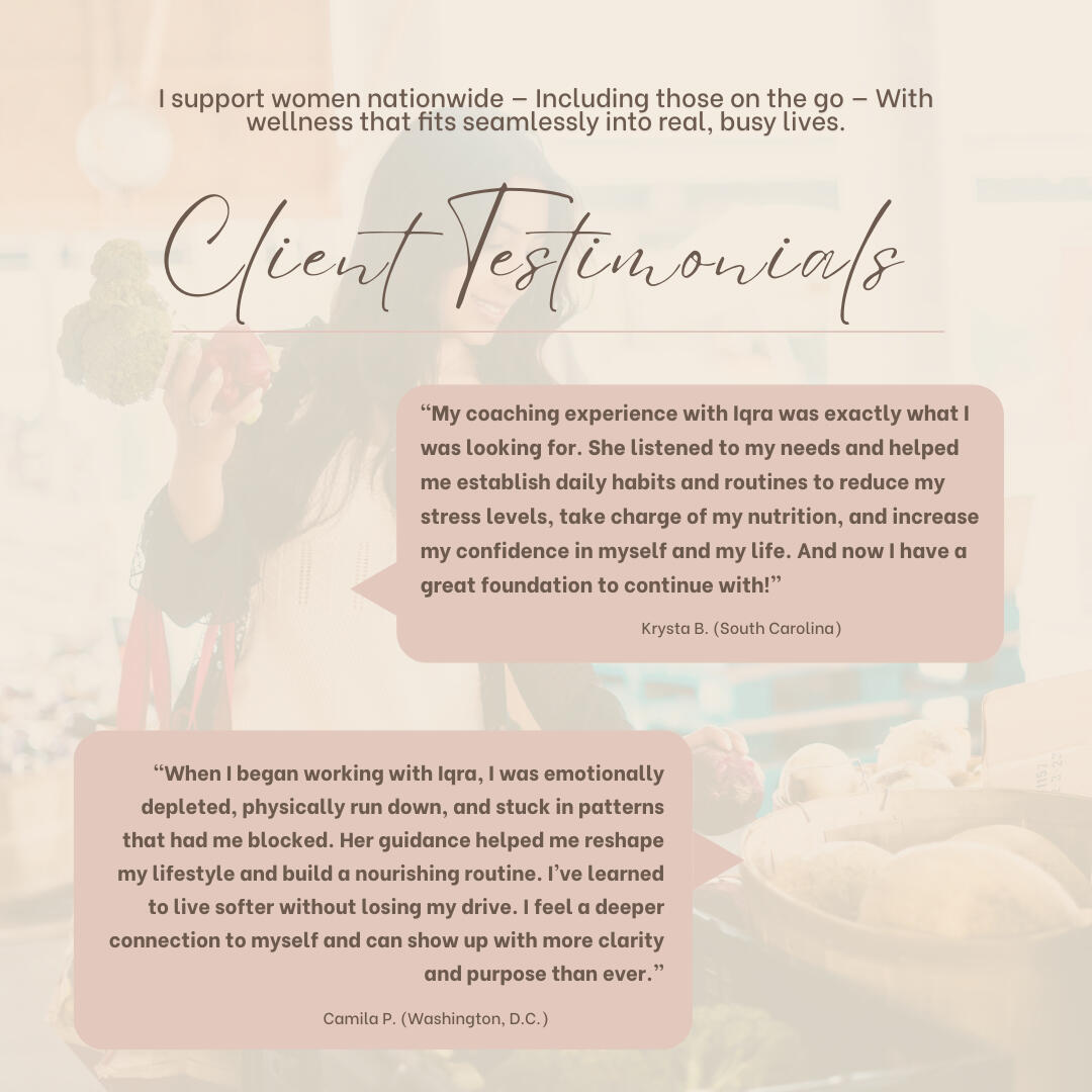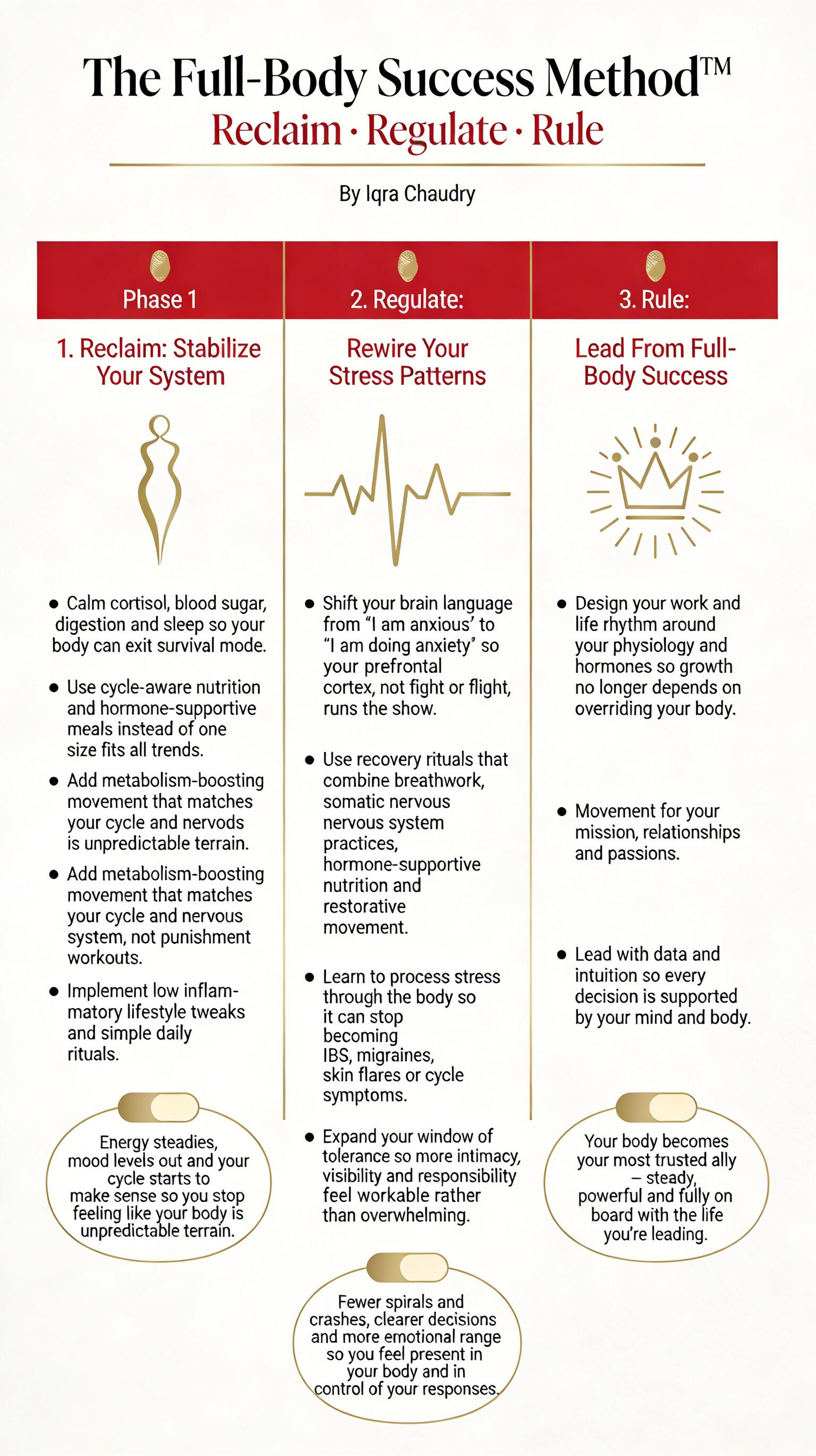 I’m Iqra, a women’s health expert and organizational psychologist who treats your nervous system and hormones as the true engine of your work, not a side project.My training weaves together Columbia University, health‑coach education with Harvard Medical School and The Institute for Integrative Nutrition, Yoga Teacher RYT‑200, Advanced Somatic Healing, and years of partnering with women and organizations like The United Nations, Dow Jones, and Avon. All of it has been in service of one problem: brilliant, high‑performing women whose bodies are quietly burning out under the weight of the lives they’ve built.I spent years watching exceptional women be applauded for their resilience while their cycles, sleep, digestion, mood, and sense of self quietly frayed and watching workplaces interpret that as a mindset issue instead of a physiological one.My work lives exactly at that intersection: women’s hormones, nervous‑system regulation, and the psychology of high achievers.I translate research and clinical training into elegant, realistic plans that match the demands of ambitious women’s lives, so you can protect your health, deepen your impact, and inhabit a body that feels as refined and powerful as the life you’ve created.